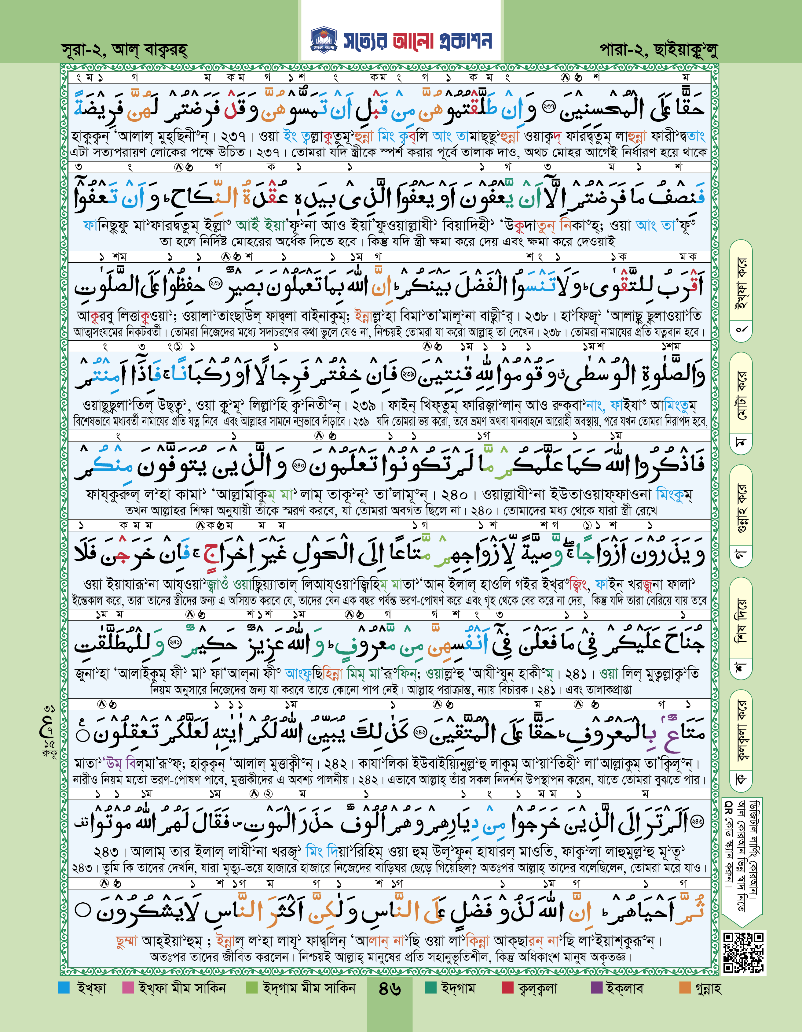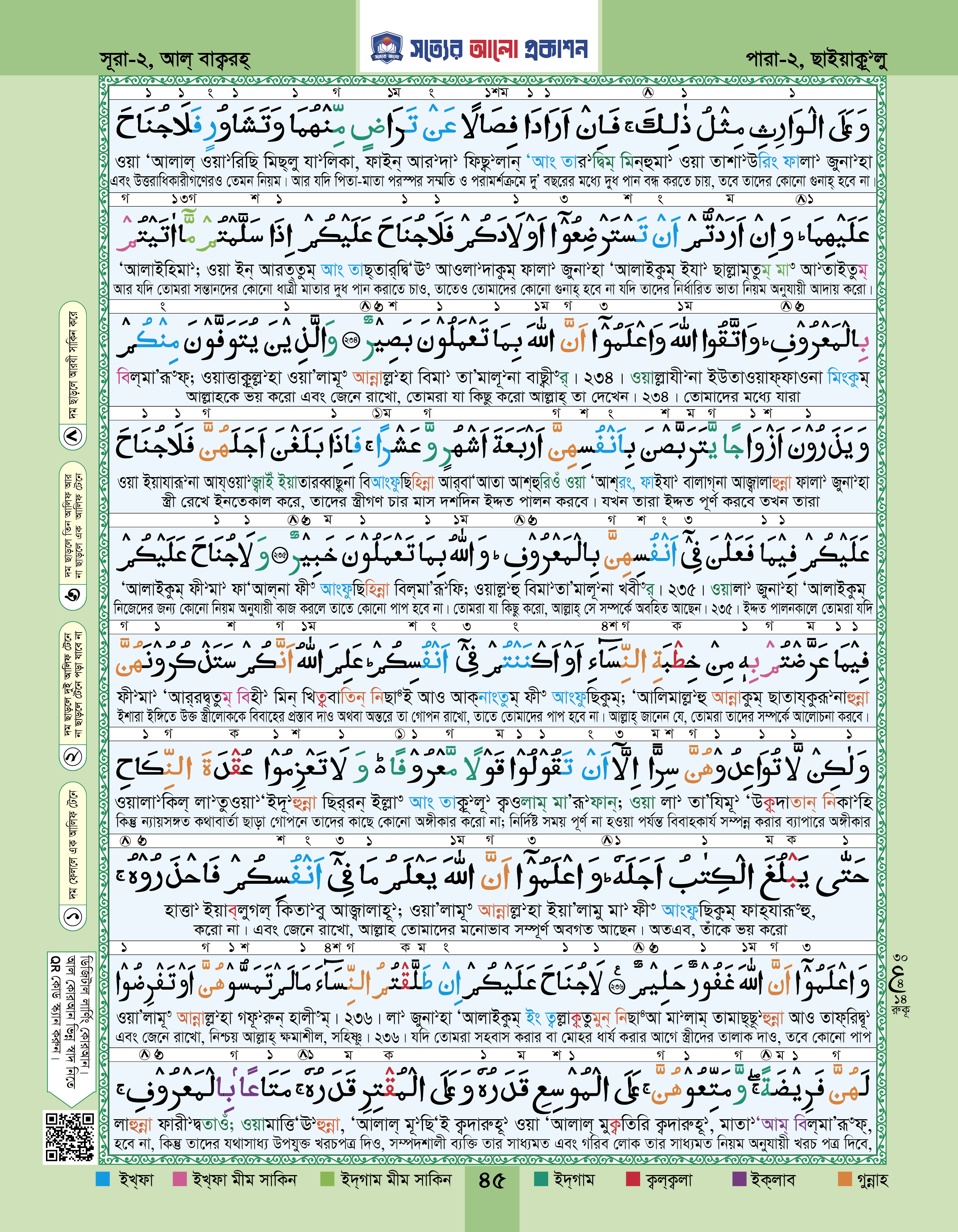 ৩। সহজ বাংলা উচ্চারণ ও গভীর অর্থ: আরবি পড়ার পাশাপাশি প্রতিটি আয়াতের নিচে পাচ্ছেন স্পষ্ট বাংলা উচ্চারণ ও সহজ সরল অনুবাদ। কেবল পড়া নয়, এবার কুরআনকে বুঝুন এবং অনুভব করুন।